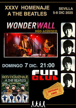 Actuación del dúo acústico WonderWall en el Fun Club de Sevilla con motivo del XXXV Homenaje Nacional a The Beatles. La formación jerezana de José Manuel Peña y Fran Pena, todo un referente en los encuentros dedicados a los fab four en España, realiza un itinerario sonoro por los clásicos del rock y del pop en inglés con el cuarteto de Liverpool como especialidad, acompañándose de guitarras alternadas ocasionalmente con piano. Entrada libre hasta completar aforo.