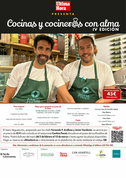 El menú degustación, preparado por los chefs Fernando P. Arellano y Javier Gardonio se servirá por un precio de 45 € todo incluido en el restaurante Cantina Panzà ubicado en el paseo de Las Ramblas de Palma. Podrá disfrutar del menú del 5 de febrero al 10 de marzo o hasta agotar las plazas disponibles.